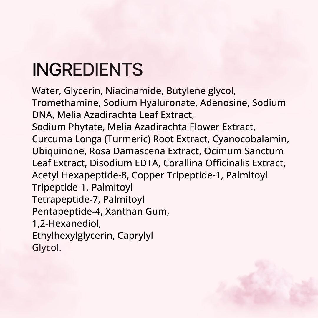 Water, Glycerin, Niacinamide, Butylene Glycol, Tromethamine, Sodium Hyaluronate, Adenosine, Sodium DNA, Melia Azadirachta Leaf Extract, Sodium Phytate, Melia Azadirachta Flower Extract, Curcuma Longa (Turmeric) Root Extract, Cyanocobalamin, Ubiquinone, Rosa Damascena Extract, Ocimum Sanctum Leaf Extract, Disodium EDTA, Corallina Officinalis Extract, Acetyl Hexapeptide-8, Copper Tripeptide-1, Palmitoyl Tripeptide-1, Palmitoyl Tetrapeptide-7, Palmitoyl Pentapeptide-4, Xanthan Gum, 1,2-Hexanediol, Ethylhexylglycerin, Caprylyl Glycol.